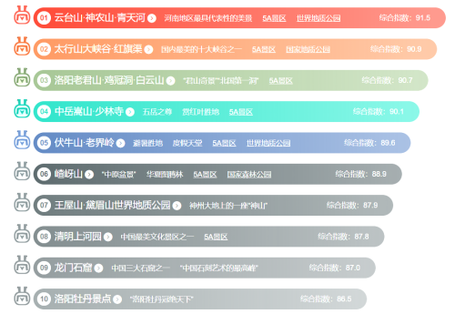 河南省最美的景点排名第一的是云台山神农山青天河,排名第二的是太行山大峡谷红旗渠,排名第三的是洛阳老君山鸡冠洞白云山。