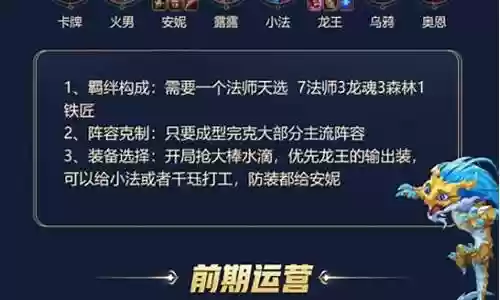 开局优先拿女神泪或无用大棒,前期过渡推荐用安妮、小法师、茂凯和璐璐凑到3永恒之森3魔法师来过渡,龙王的装备可以先给小法师打工用,或者用千珏打工也可以。
