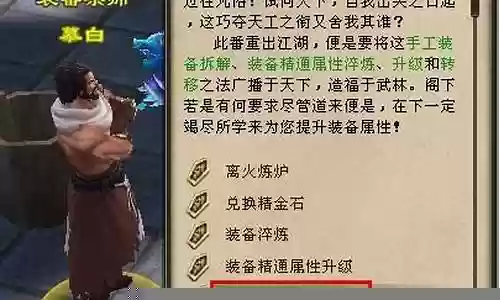 相关NPC在苏州风冶子(神器相关NPC附近)旁边,点击之后,会出现多个选项:其中就有“离火炉炼”、“兑换精金石”、还有就是升级的、淬炼装备。大概操作就是,通过“离火炉炼”获得材料,离火是用来洗属性的,精金石是用来升级的。淬炼装备也可以获得部分材料。