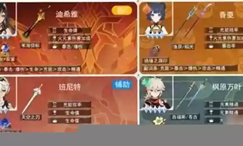对于辅助位,要求可以低一些。比如拿行秋作为挂水工具人,那么只需要准备好祭礼剑之类的武器,堆一些充能保证挂水的续航即可;拿dio娜作为奶妈,技能、圣遗物、等级都可以拉一拉,拉到自己够用的奶量,也就可以放在一边不管了;拿砂糖做反应增伤工具人,只需要拉到60突破,带一套风4,堆一些精通即可使用了。